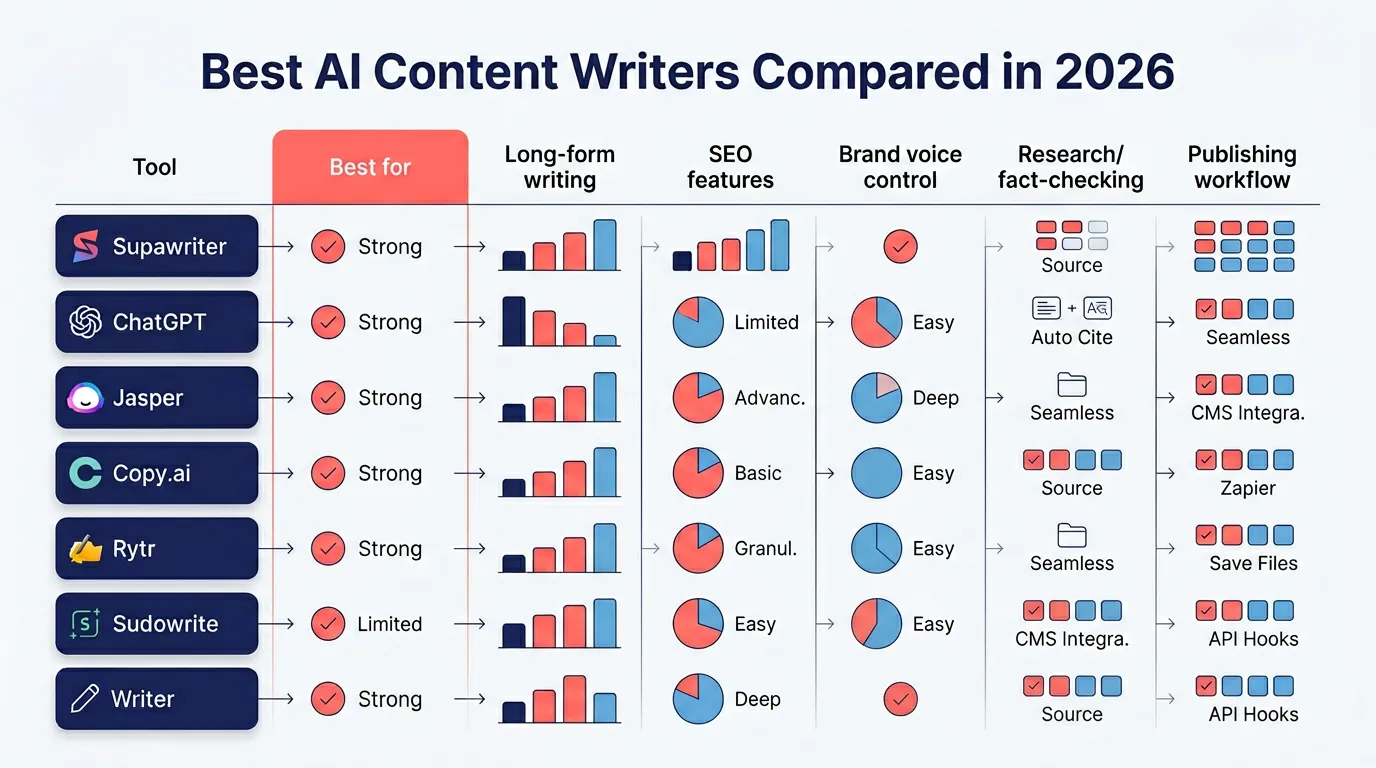 | Supawriter | SEO teams and B2B blogs | Strong | Strong | Strong | Strong | Strong |